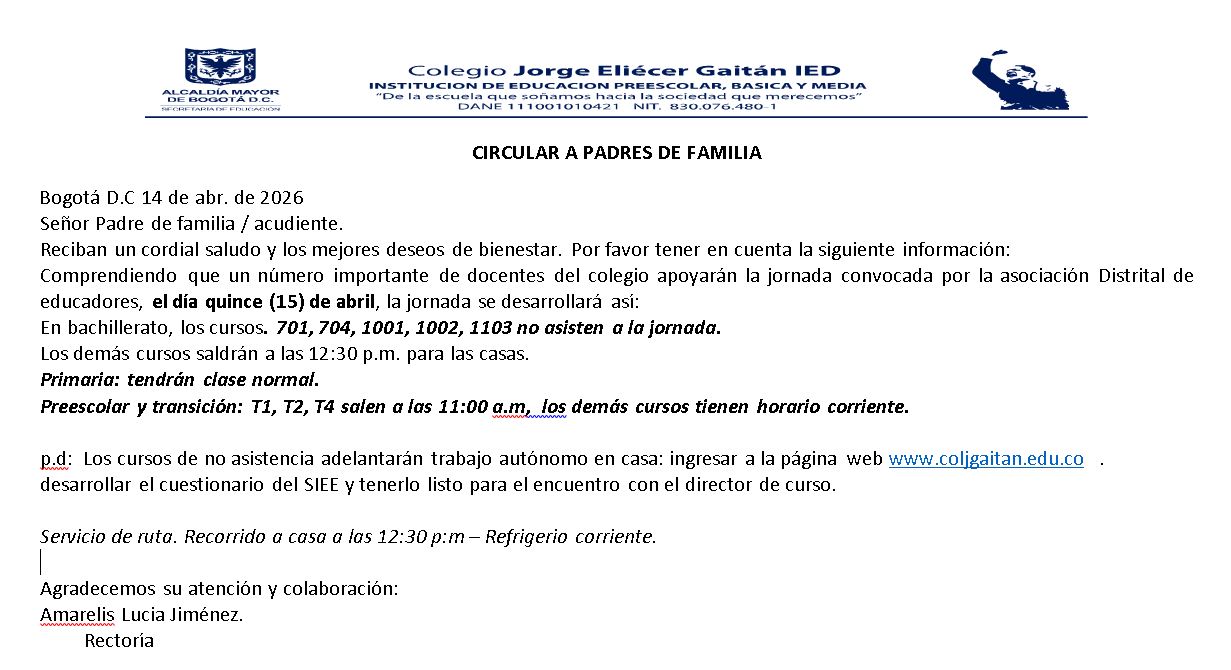 El Colegio Jorge Eliécer Gaitán dentro de su misión y visión institucional, proyecta una formación integral para sus estudiantes y sus familias, en concordancia con lo establecido por la Ley 2025 del 2020 ha organizado La Escuela de Padres “Creciendo en familia” y su asistencia es obligatoria.